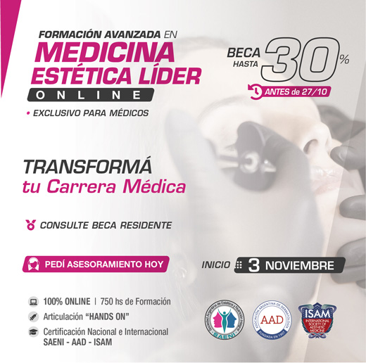 Sede: Modalidad: 100% online, 750 horas de formación. Dirigido a: exclusivo médicos. Articulación: Hands On. Certificación: nacional e internacional SAENI, AAD, ISAM. Becas: 30% antes del 27/10. Consulte beca residente. Más info