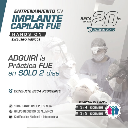 Sede: SAENI Buenos Aires: Av. Rivadavia 4447, piso 1, CABA. Día extra de práctica en técnica FUE. Modalidad: Presencial, 100% hands on, grupo reducido de alumnos. Dirigido a: exclusivo médicos. Certificación: nacional e internacional. Opciones de fechas: 3 y 4/12 o 3 y 5/12. Becas: 20% hasta el 27/10/25. Más info
