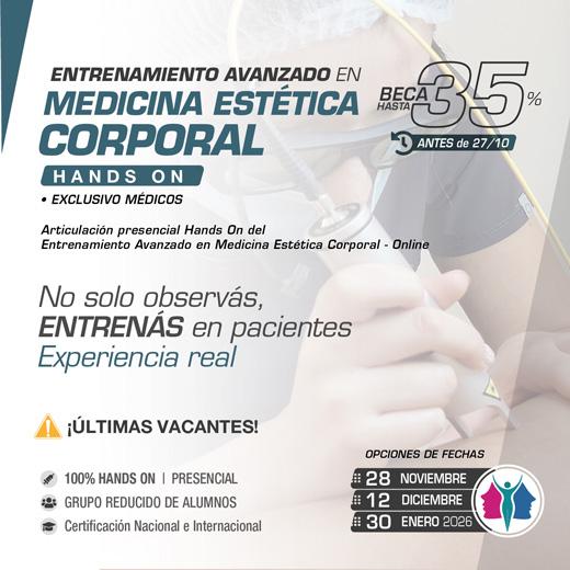 Sede: Modalidad: presencial, 100% hands on, grupo reducido de alumnos. Articulación presencial Hands On de la Especialización en Medicina Estética Facial (online). Dirigido a: exclusivo médicos. Certificación: nacional e internacional. Vacantes: limitadas Ultimos cupos. Opciones de fechas: 28/11, 12/12 ó 30/1. Becas: 35% hasta el 27/10. Más info