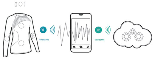 OMSignal En este caso, como en el de la camiseta que puede detectar convulsiones epilépticas, los datos recolectados van directamente a una aplicación de un teléfono inteligente. A su vez, se puede acceder a la información en un sistema de nube, para que ésta sea analizada a través de complejos algoritmos".