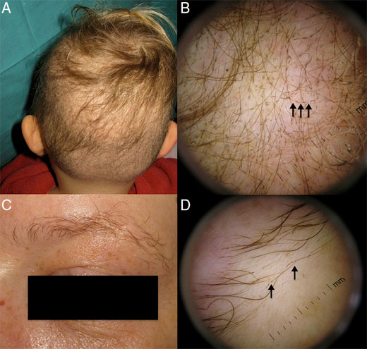El presente cuadro trata de una displasia pilosa hereditaria adquirida poco común, monilethrix, de herencia autosómica dominante en la mayoría de los casos y que, de forma característica, presenta un patrón arrosariado en la tricoscopía.